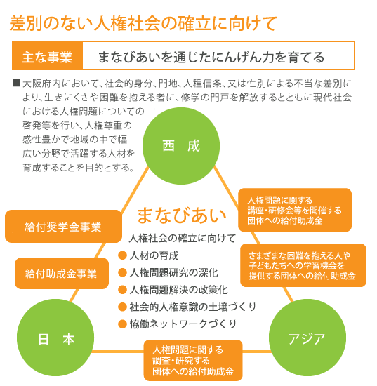 大阪府内において、社会的身分、門地、人種信条、又は性別による不当な差別により、生きにくさや困難を抱える者に修学の門戸を開放する為に、給付奨学金事業を行います。
